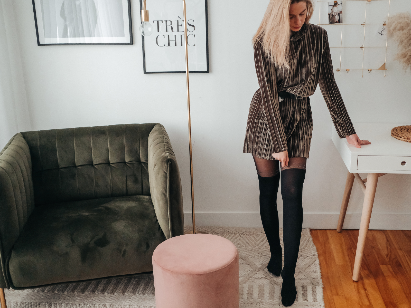Ultra trendy, the velvet dress is everywhere this season. For a family Holiday dinner, combine your velvet dress with glitter tights and get an on-point Holiday look. The best part? You'll also love to wear this tights style after Christmas.